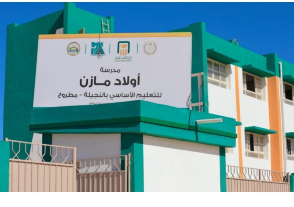 درية عبدالرحمن _ افتتح البنك الأهلي المصري ومؤسسة مصر الخير، مدرسة أولاد مازن للتعليم الأساسي بالنجيلة بمحافظة مطروح وذلك بعد إنتهاء الأعمال الإنشائية وتجهيز إستراحة للمعلمين وكافة المعامل والتجهيزات اللازمة.