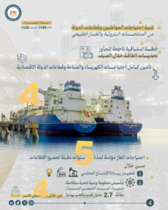 فبالإضافة إلى جهود زيادة الإنتاج المحلى فقد تم تأسيس منظومة وبنية تحتية متكاملة لاستيراد الغاز الطبيعي المسال عبر سفن التغييز، بطاقة تصل إلى 2.7 مليار قدم مكعب يومياً، وبجهود أكثر من 1500 زميل وزميلة من قطاع البترول.