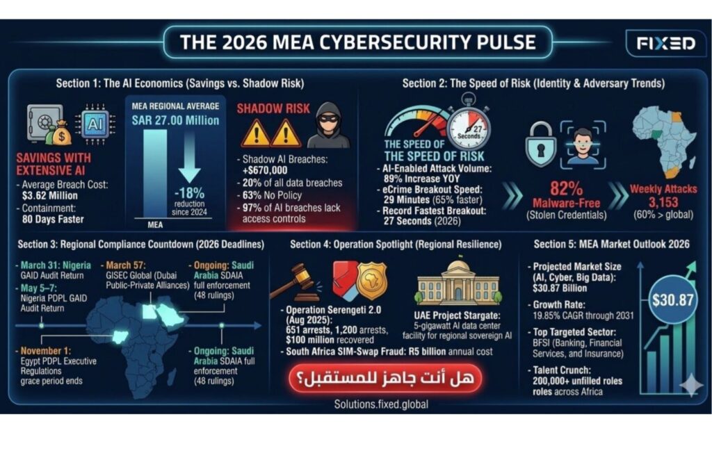 علي أحمد _ اصدرت شركة Fixed Solutions تقريرها التحليلي الجديد بعنوان”اتجاهات الأمن السيبراني 2026 في الشرق الأوسط وأفريقيا والذي يرصد أبرز التحولات التي يشهدها مشهد الأمن السيبراني في المنطقة في ظل تسارع الاعتماد على التقنيات الرقمية وتزايد التهديدات السيبرانية المدعومة بالذكاء الاصطناعي.
