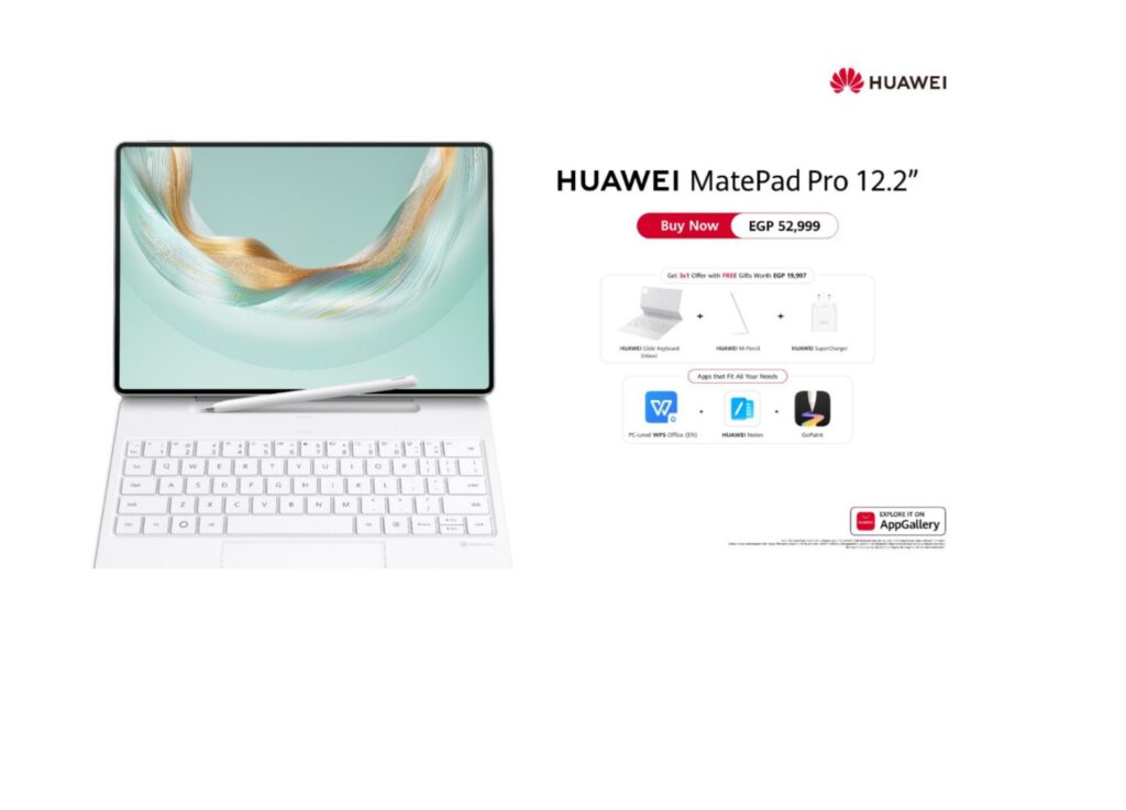 يتوفر الآن HUAWEI MatePad Pro 12.2” للشراء من خلال متجر هواوي HUAWEI Experience Store )HES) والمتجر الإلكتروني وبعض الموزعين المعتمدين في مصر بسعر 52,999 جنيهًا مصريًا.